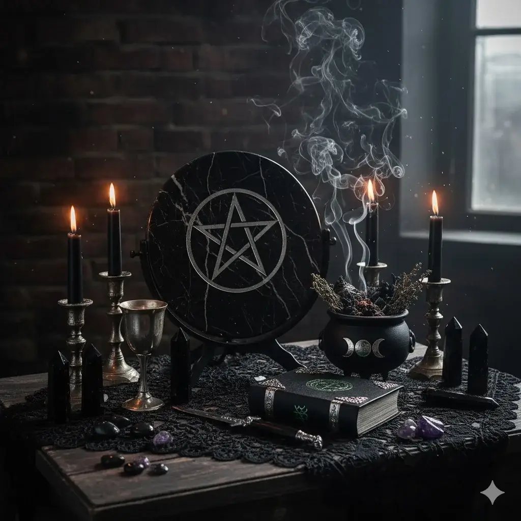 Altar negro de poder y misterio, iluminado por velas doradas y rodeado de cristales y símbolos esotéricos. Un espacio sagrado donde la energía oscura se transforma en fuerza espiritual, ideal para rituales de protección, conexión interior y magia ancestral.